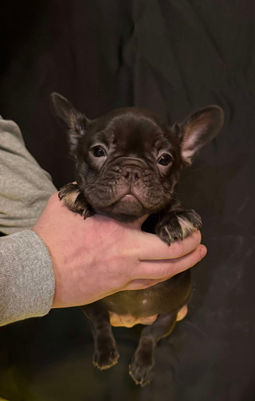 Mrs. Francesca is our Solid Black Merle carrying 1 copy of co and 1 copy of d. We co-own this girl with the wonderful couple at Show Me Bulldogs.